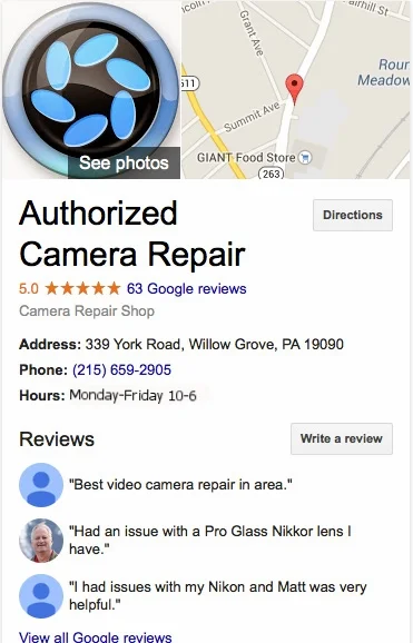 Authorized Camera Repair is the only professional camera repair shop in the metro Philadelphia Pennsylvania area. Customers come far and wide to take advantage of our top quality repair service .